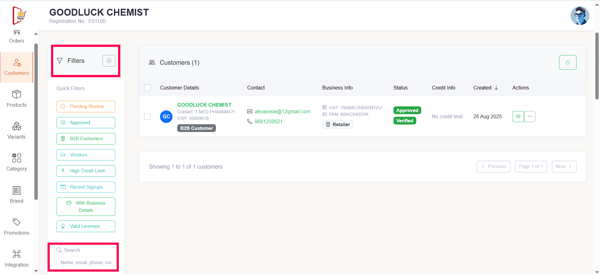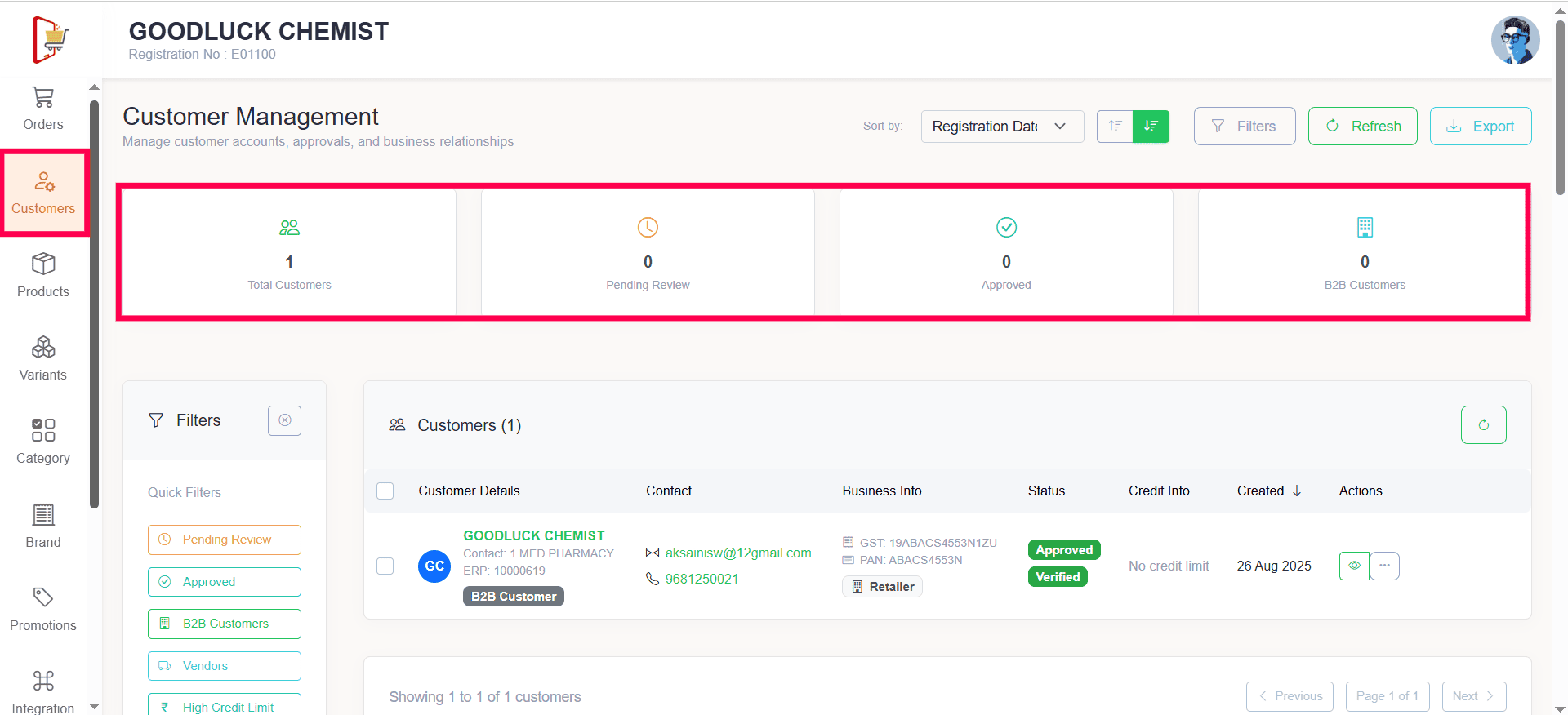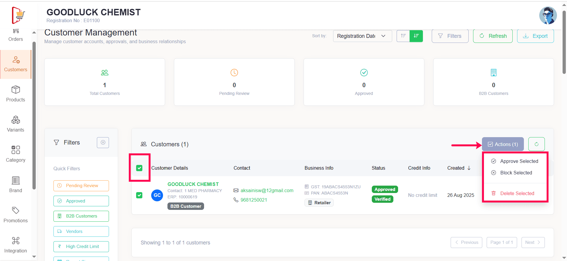 The SwilMart Admin Portal lets admins manage customer accounts quickly from one dashboard. From new registrations and approvals to business detail verification and credit checks, everything is simple and accurate. With smart filters and search tools, you can sort customers by type, status, category, or documents like GST and PAN for faster onboarding and stronger relationships.