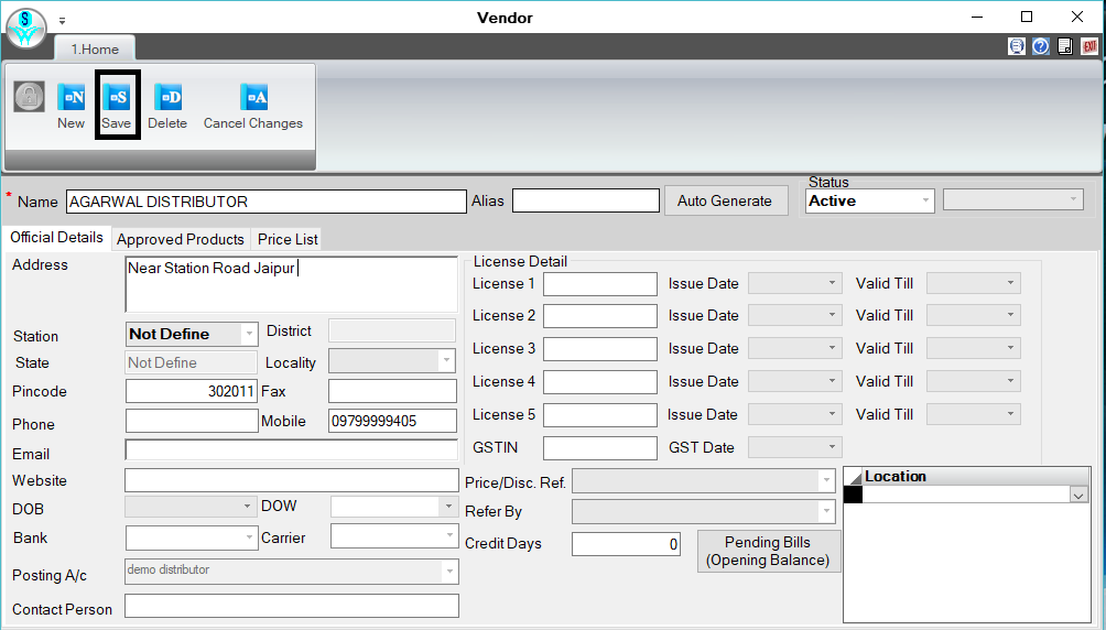 Step3: Click “Start” button of the software-> Purchase-> Purchase invoice and click the drop-down at the vendor name-> Select new and press enter button if you wants to create a new Vendor And make a new vendor and click SAVE button as shown in the image.