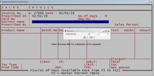 After press CTRL+E key, we have to enter Old Invoice No. which items we want to copy in New Invoice. Software will make the New Invoice same in every way except for the Invoice No.