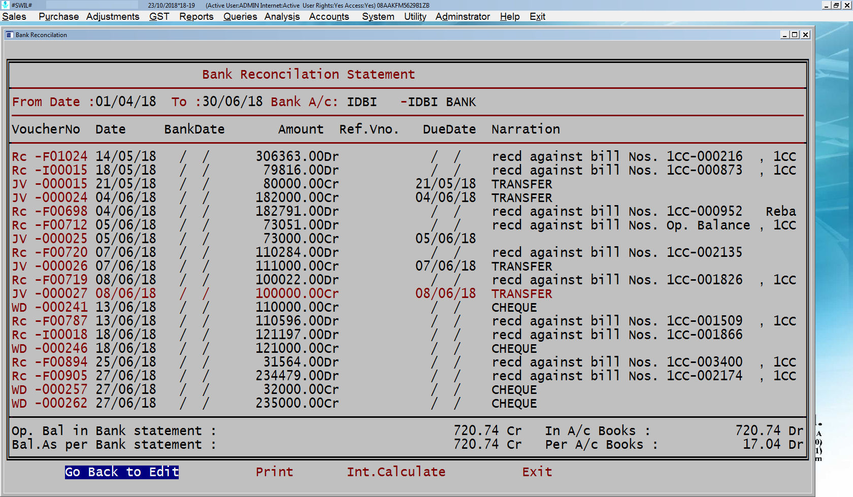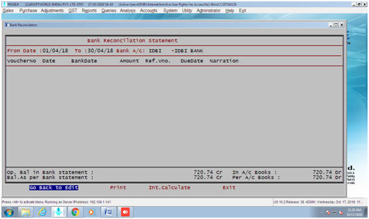 · Now you can print and see bank reconciliation statement which mentions the reasons why there is a difference in your books and bank statement. It is important document and must be printed daily/weekly or monthly as per your transactions volume. Bank reconciliation statement looks like following image:-