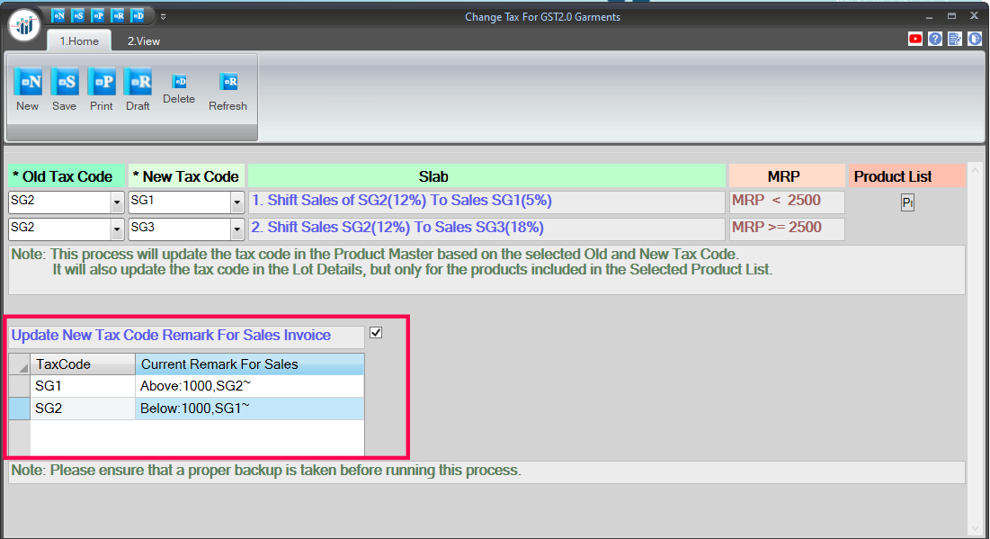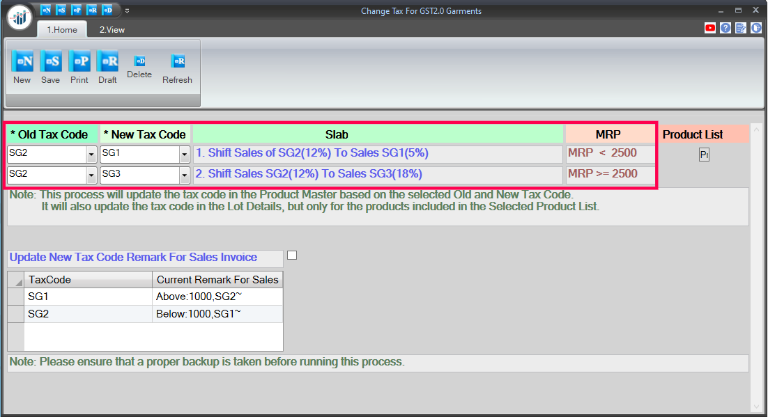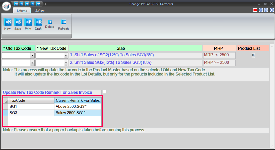 - Choose SG2 (12%) in the Old Tax Code column and SG3 (18%) in the New Tax Code column to shift sales from SG2 (12%) → SG3 (18%).