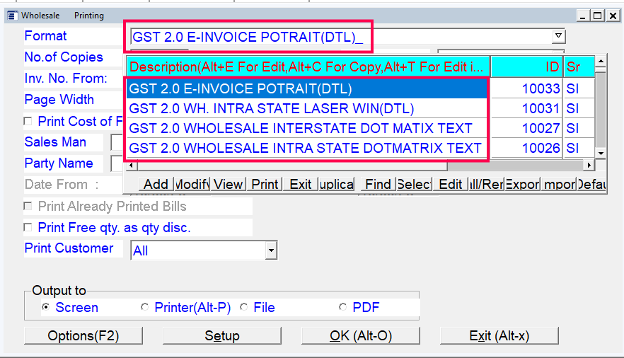To print the invoice, the default formats will start with GST 2.0. Select format and then print the invoice.