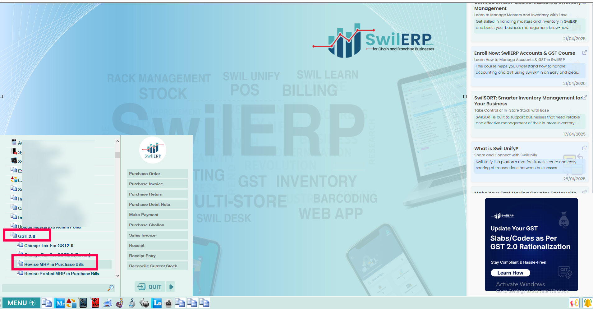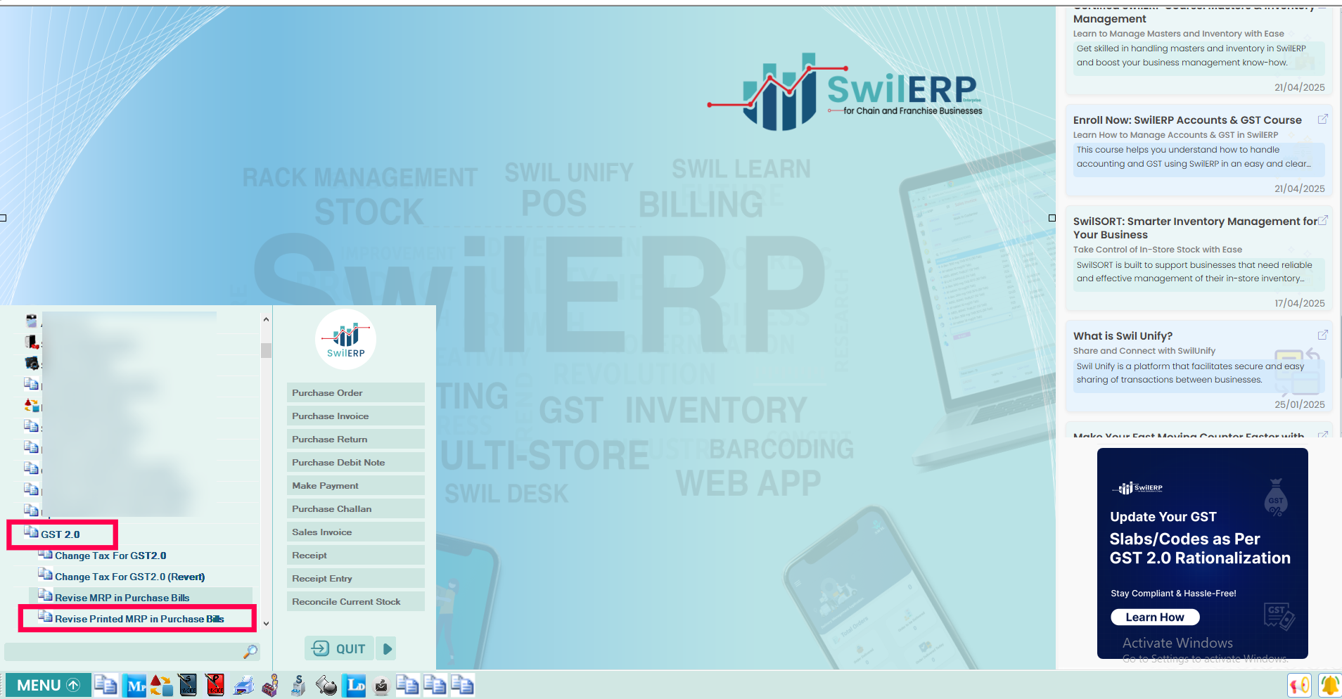 After the GST 2.0 update, many businesses need to revise their product MRPs in purchase bills to ensure billing and compliance accuracy. SwilERP now provides two new options under the GST 2.0 menu that help you update both Revised MRP and Printed MRP as per purchase bills.