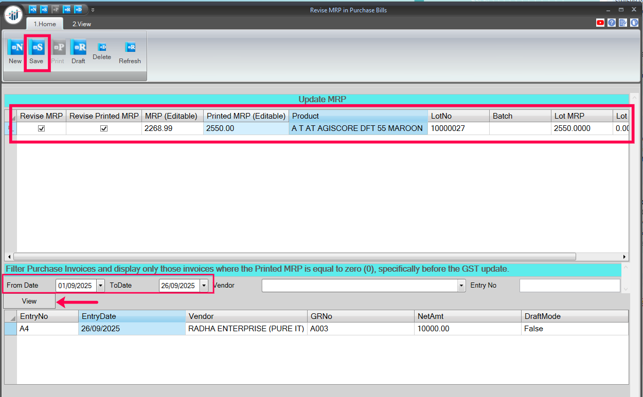 Option 1: Revise MRP in Purchase Bills Entered Till 21st September