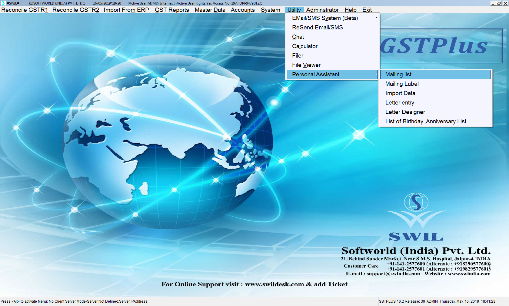 Utility: Now in GST Plus you can send Mail/SMS, Making Letter Master & Print also & Create Label Master & Print also. Screen as per below: