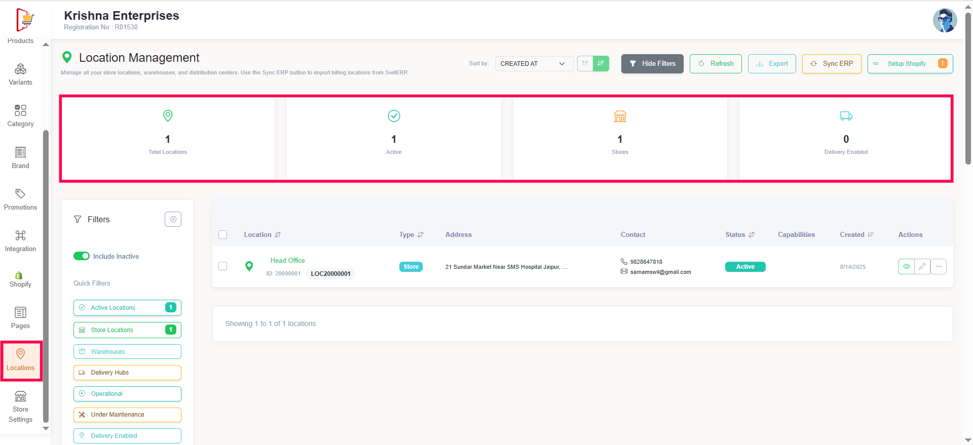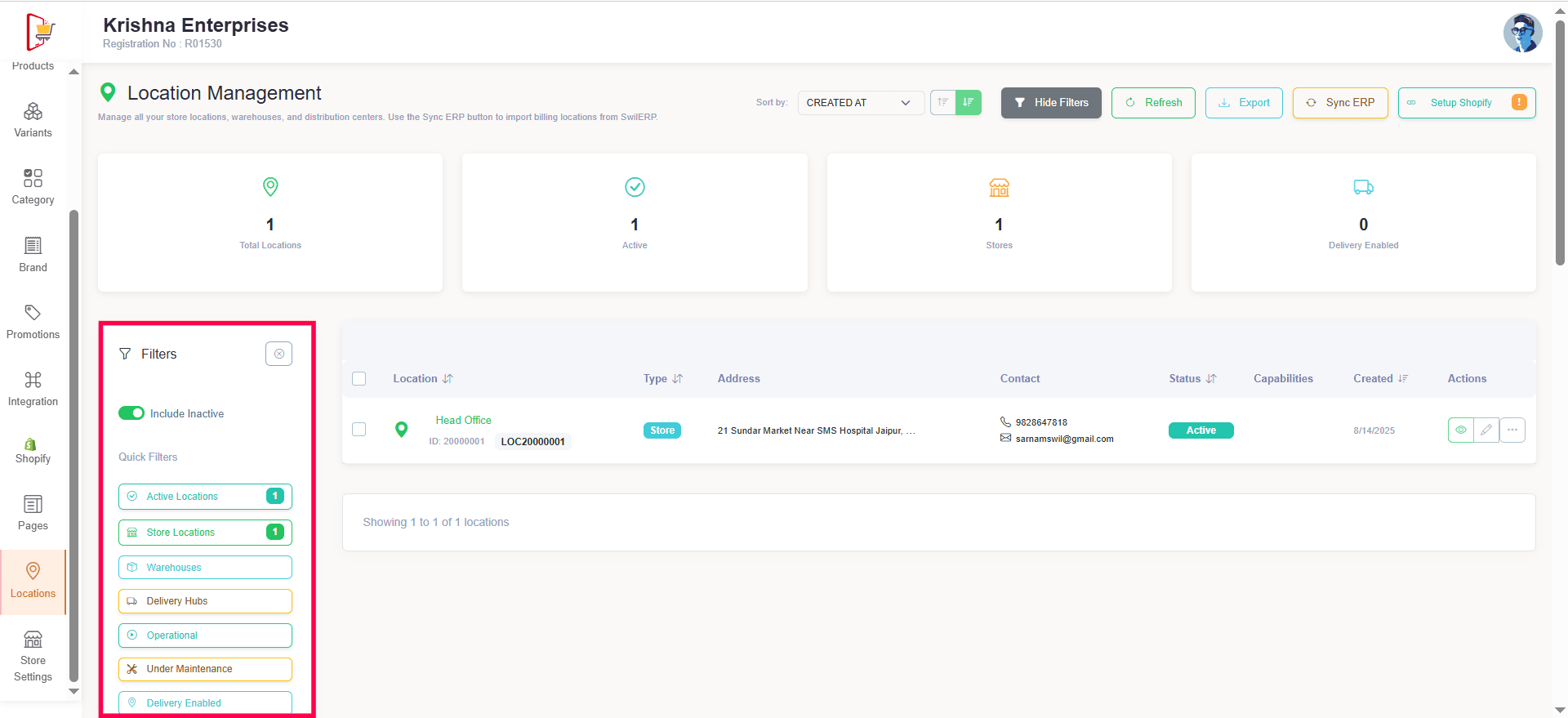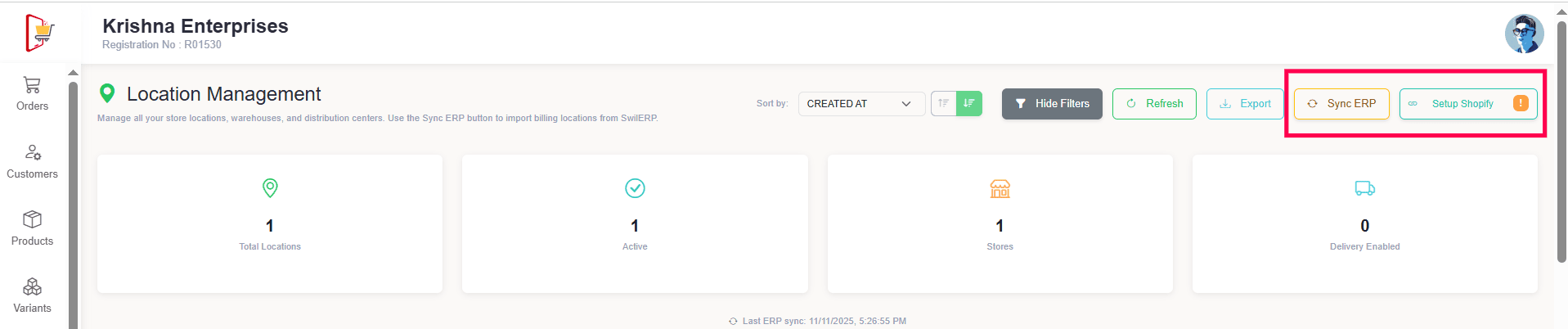 Click the Sync ERP button to import the latest billing locations from SwilERP into Shopify.
