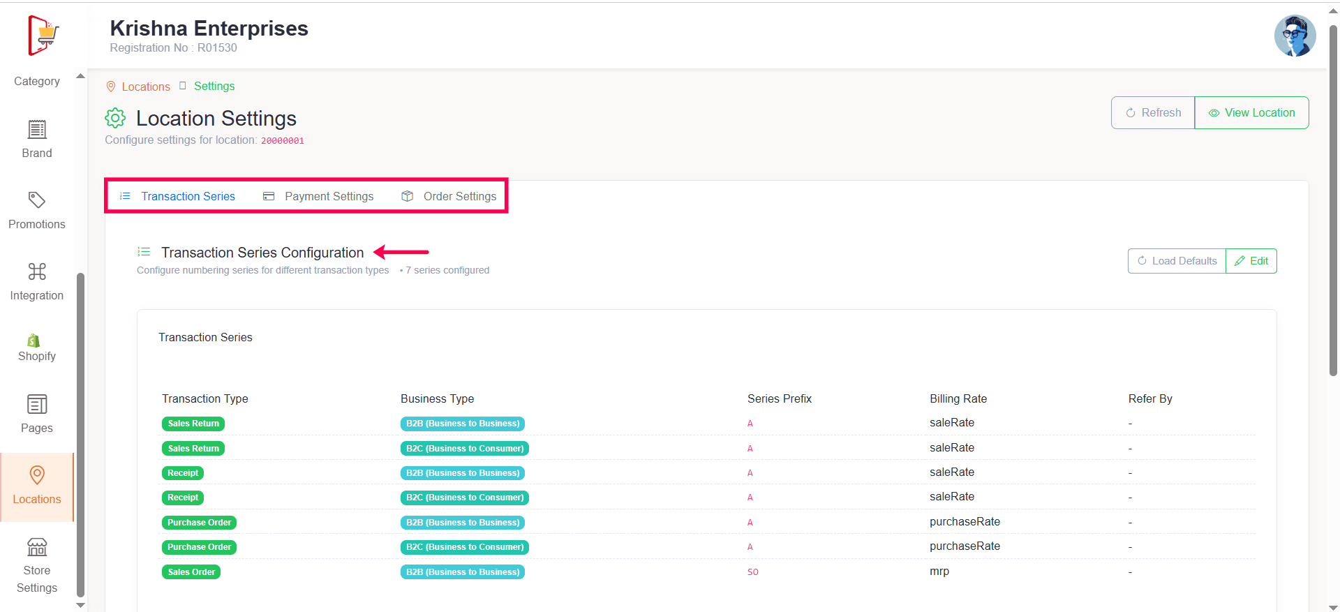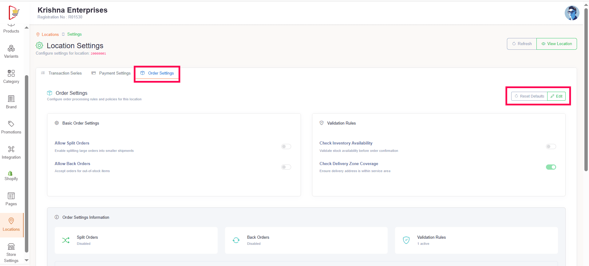 Go to Order Settings to configure order processing rules and policies for the selected location.