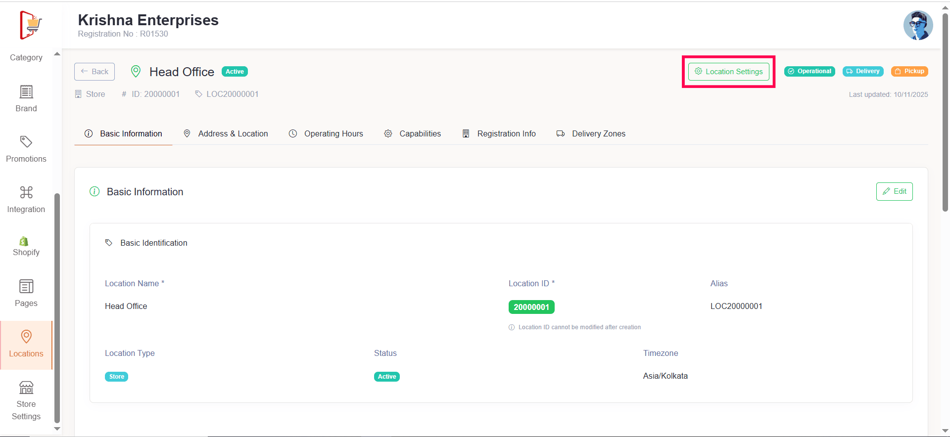 The Location Details window will open showing basic information like ID, status, and timezone.