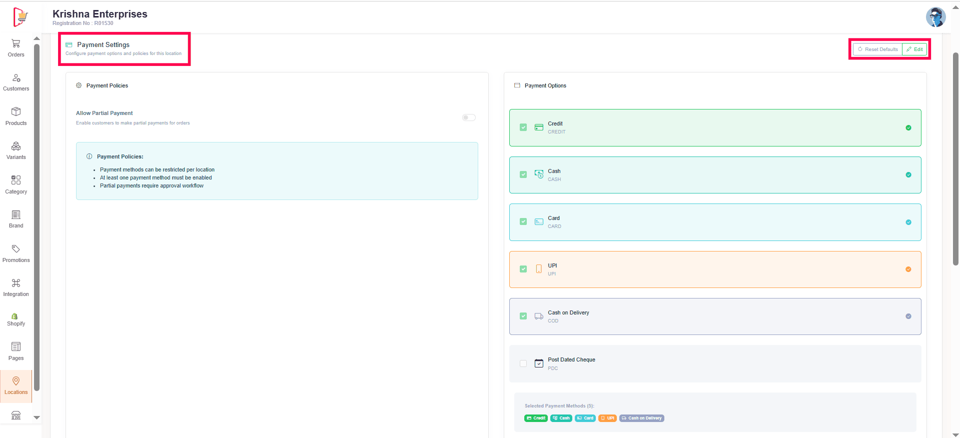 Go to Payment Settings to configure payment options and policies for the selected location.