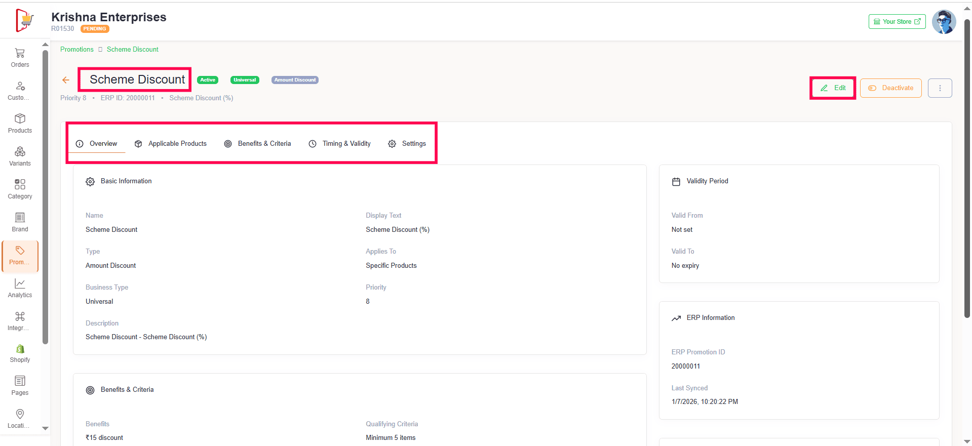 Click on the promotion name you want to edit (for example, Scheme Discount).