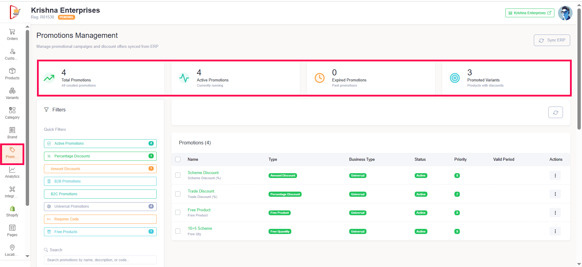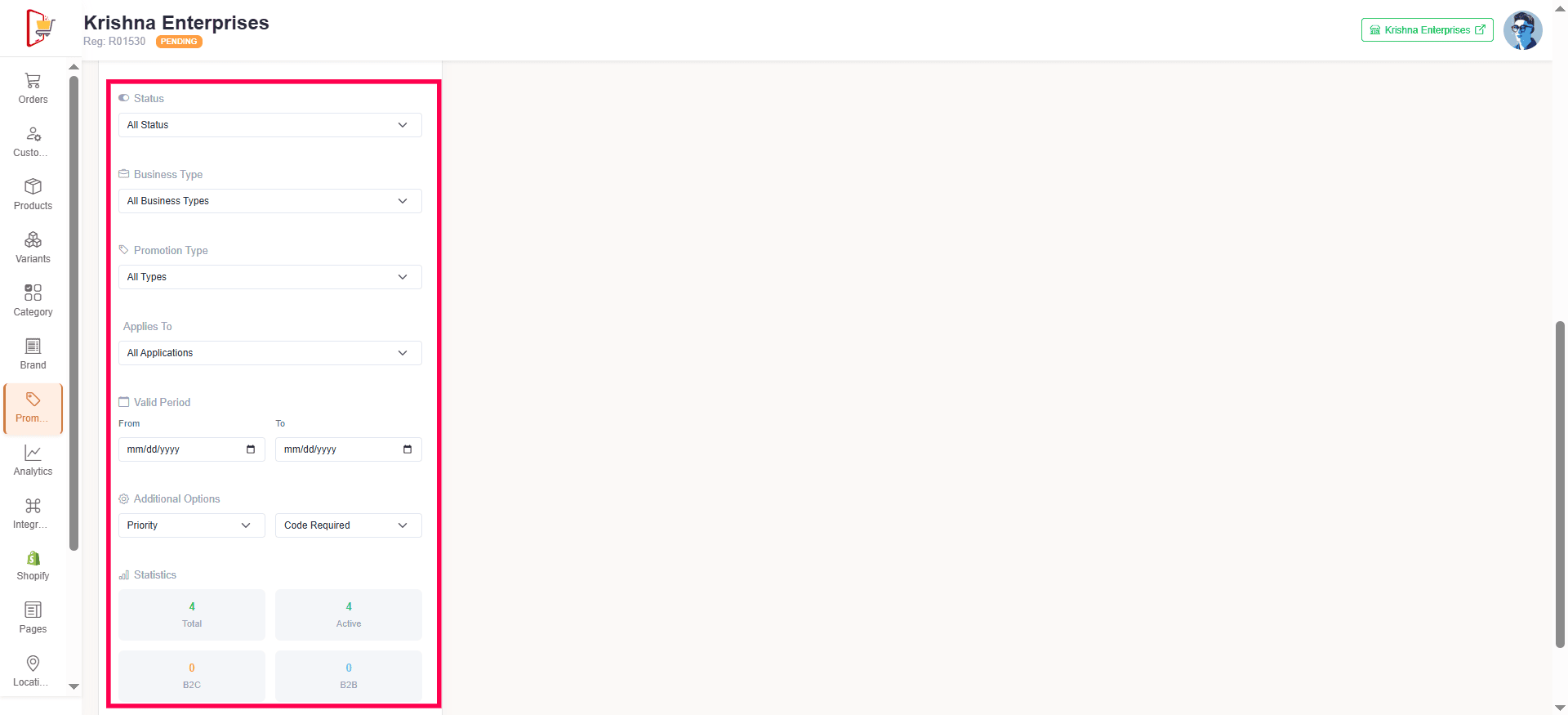 Statistics – View quick counts of Total, Active, B2B, and B2C promotions.