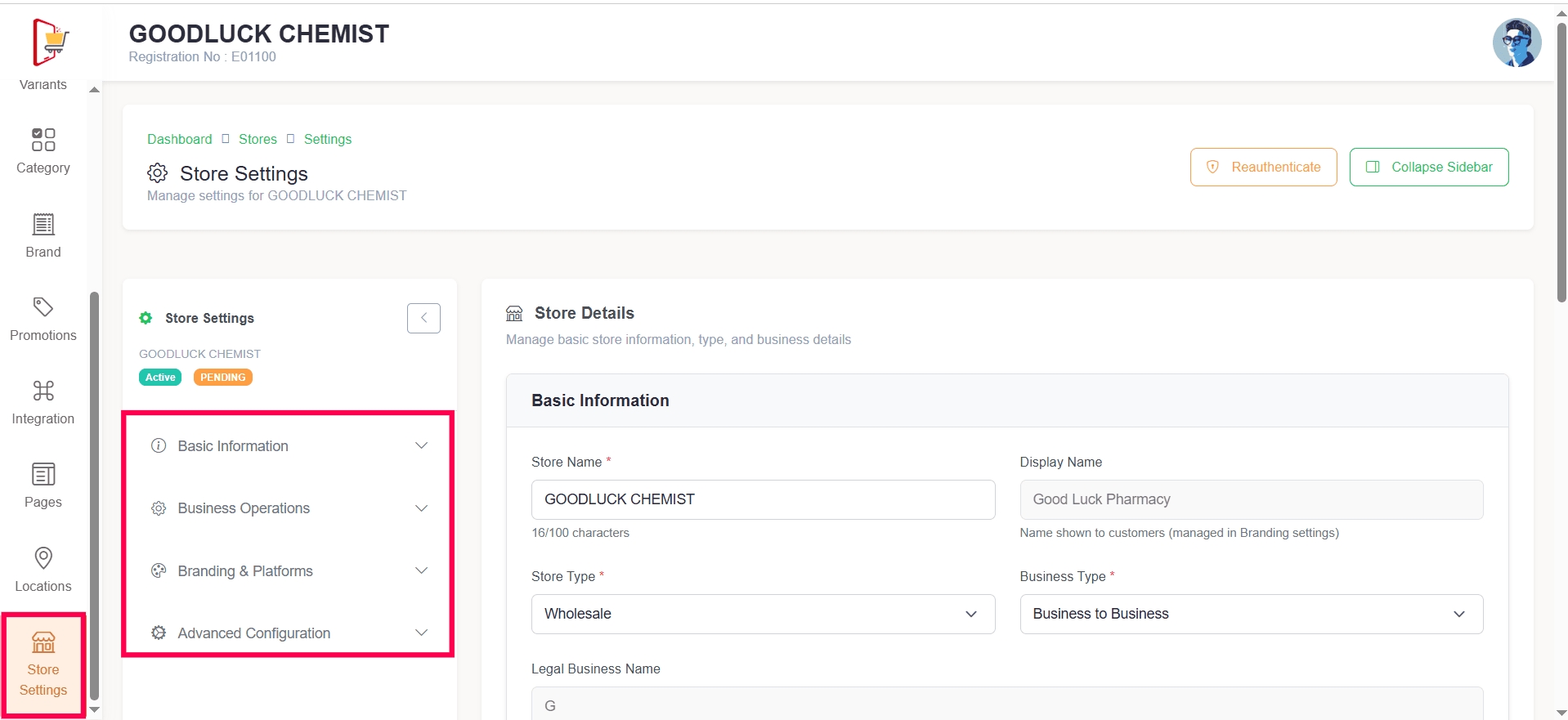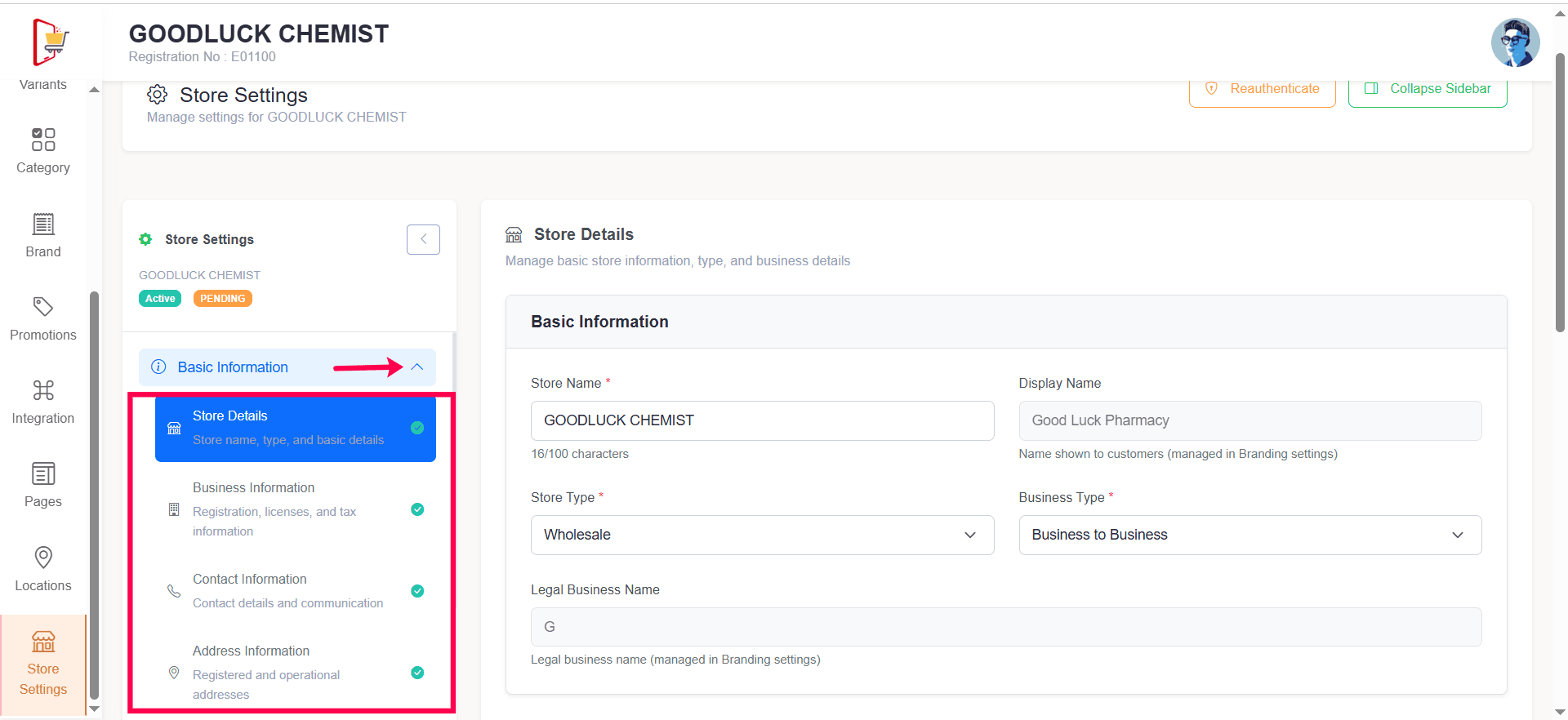This section is used to set up the core details of your store. Filling in the Store Name, Store Type, and Business Type is mandatory. Other details can be added as needed.