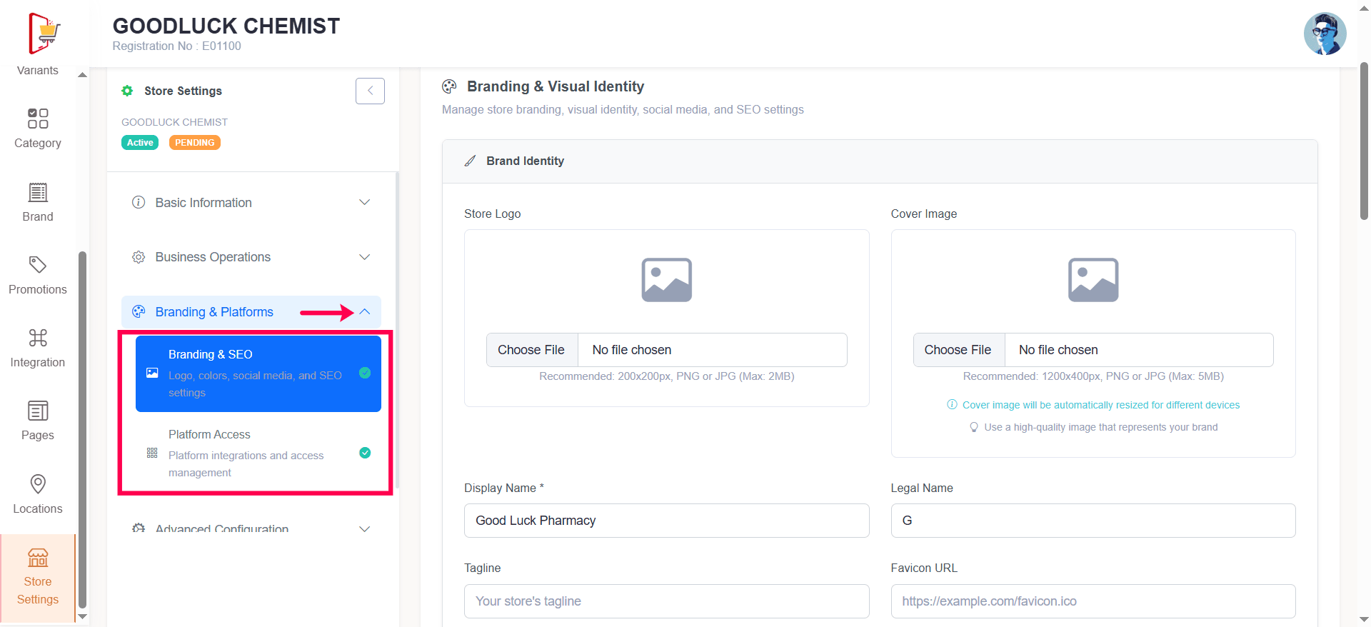 Business Operations Details WindowThis section manages your store’s visual identity and platform access.