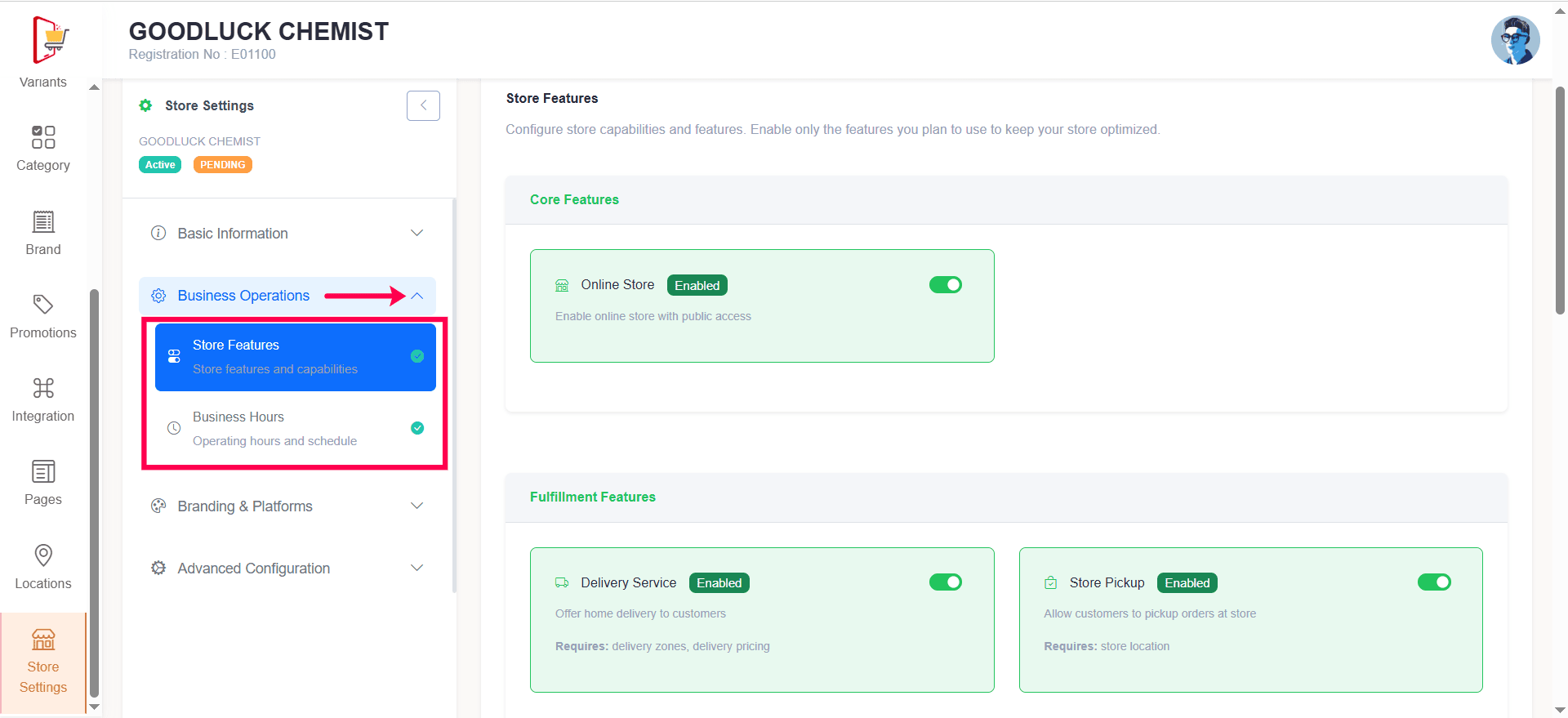 Store Features – Enable or disable features such as Online Store, Delivery Service, and Store Pickup.