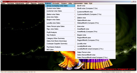 25. Comparison of Sales from Current year to last year: This is more useful feature to compare your last year sales with the current year sales with month wise for this go to analysis menu Customer wise, Product wise, Company wise, Station wise, Area Wise